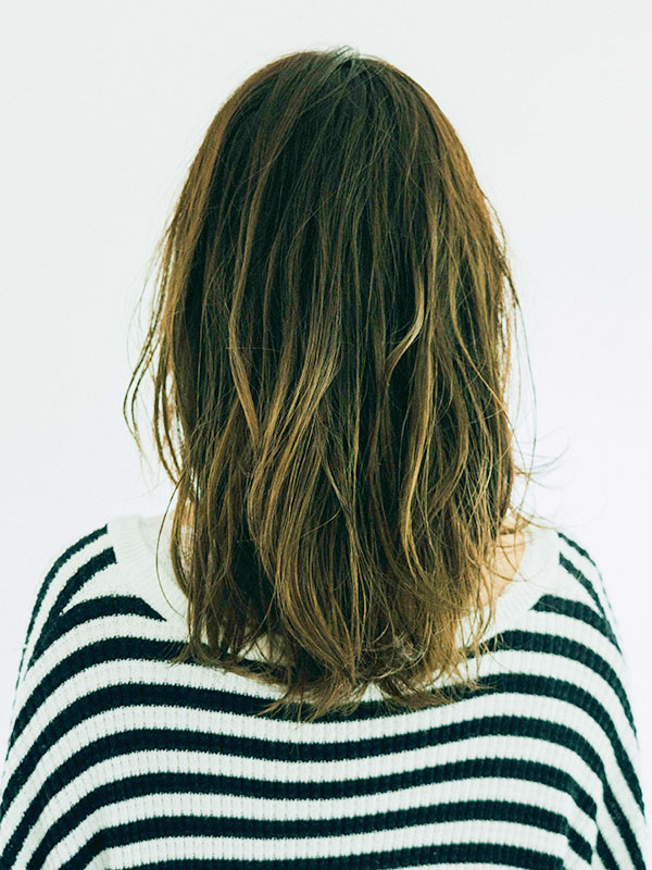 根元にボリュームが出るようにドライ後、32ミリのコテで無造作に巻きます。トップのレイヤーが入っている部分はポイントで毛束をとり緩めに巻きます。その後バームまたはオイルを中間毛先をメインになじませて完成です。