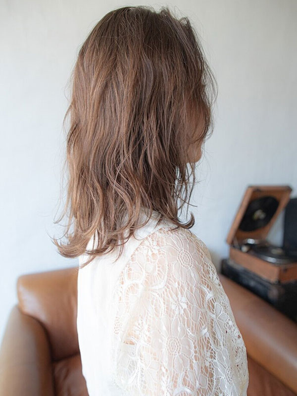 鎖骨くらいのミディアムスタイルに切りました。トップにレイヤー入れてポイントは顔まわりのバングレイヤーで、空間を作りました。カラーはくすみ感のあるベージュです。暗い髪の方は一度明るくしてから染めると透明感が出るのでオススメ。